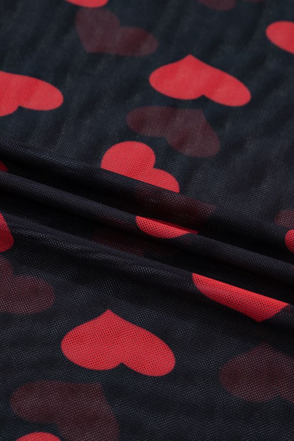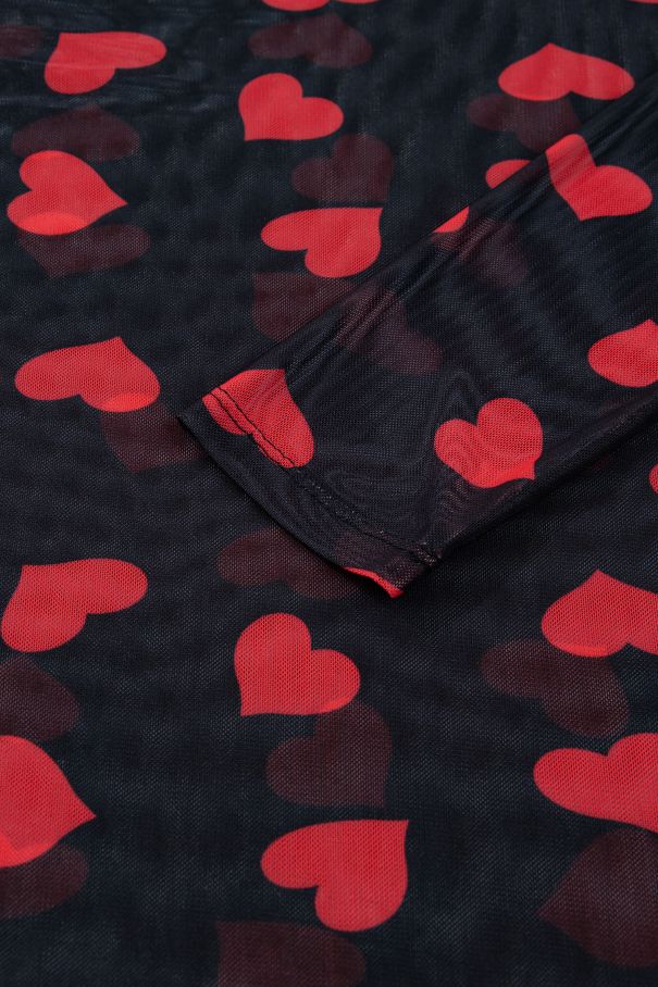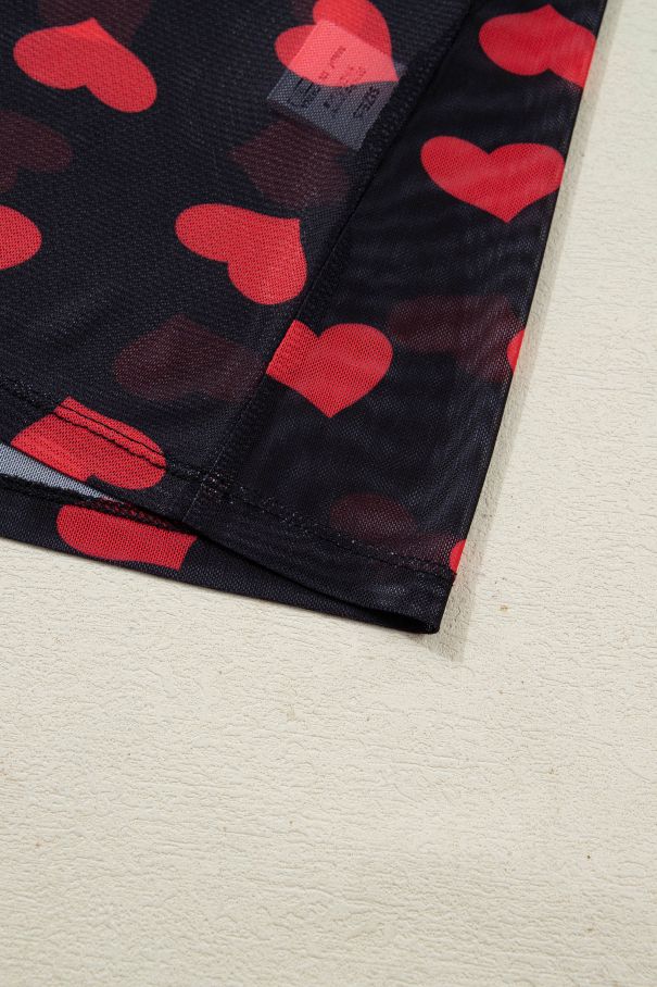 Дамска черна мрежеста блуза с дълъг ръкав и принт на червени сърца
