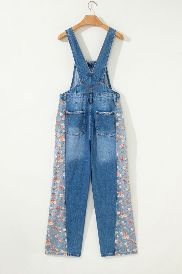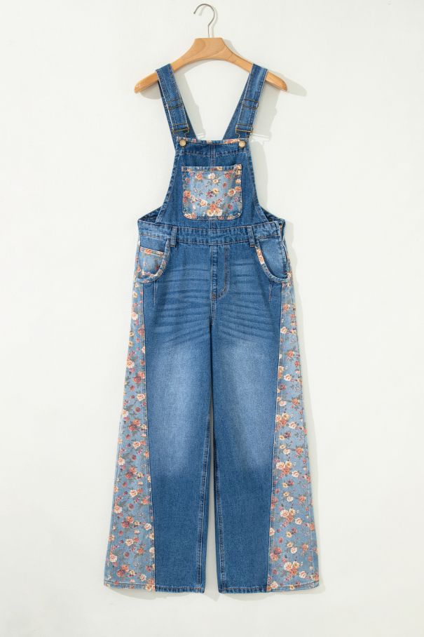 Дамски дънков гащеризон с широк крачол и флорален принт