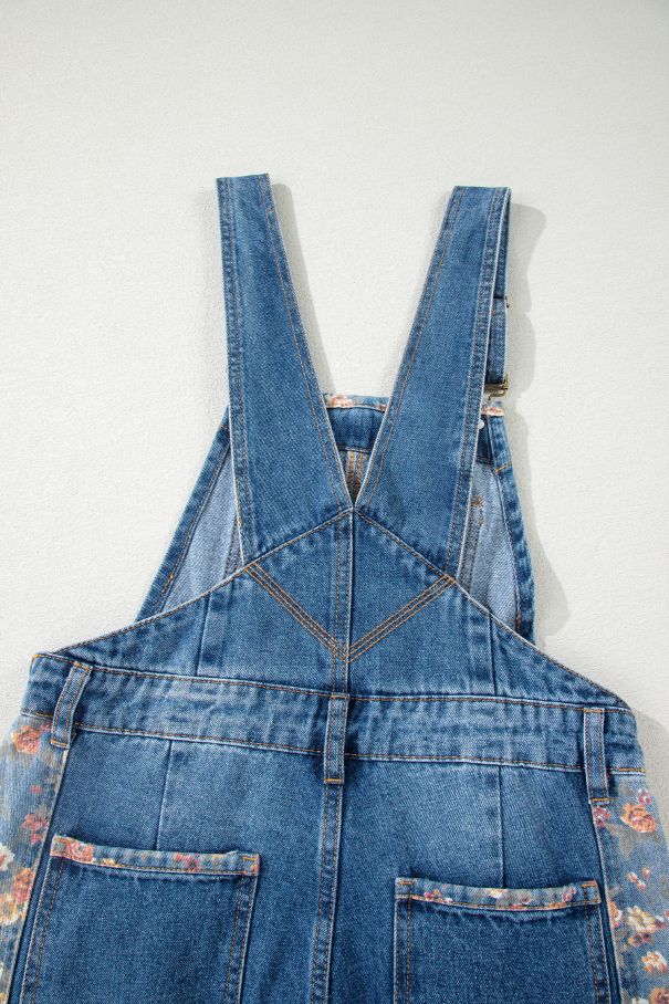- Дамски дънков гащеризон в син цвят с модерен износен ефект и флорални акценти.