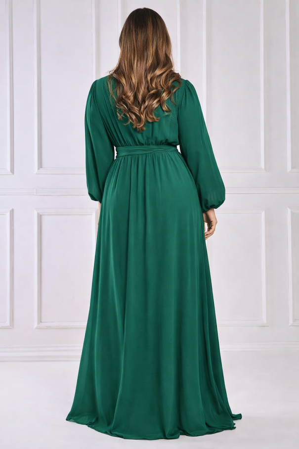 Дамска дълга елегантна рокля GODDIVA в зелено с цепка и V-образно деколте