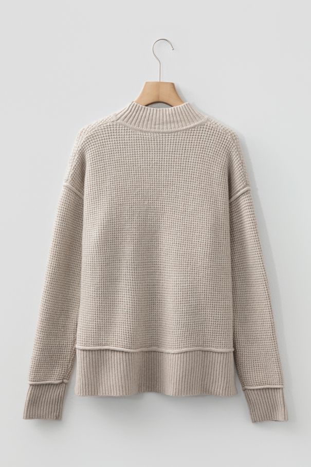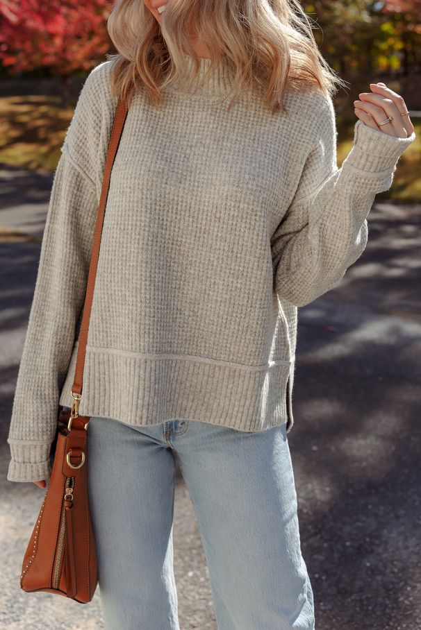 - Стилен дамски пуловер в бежово-сив нюанс с висока яка, дълъг ръкав и свободна, удобна кройка.