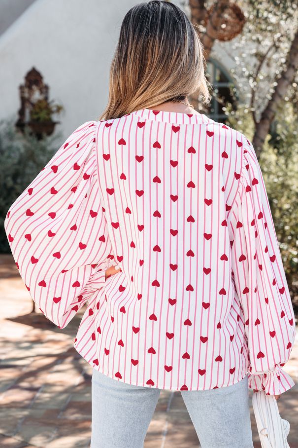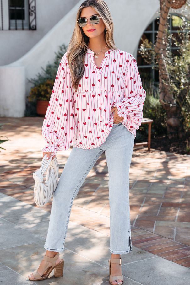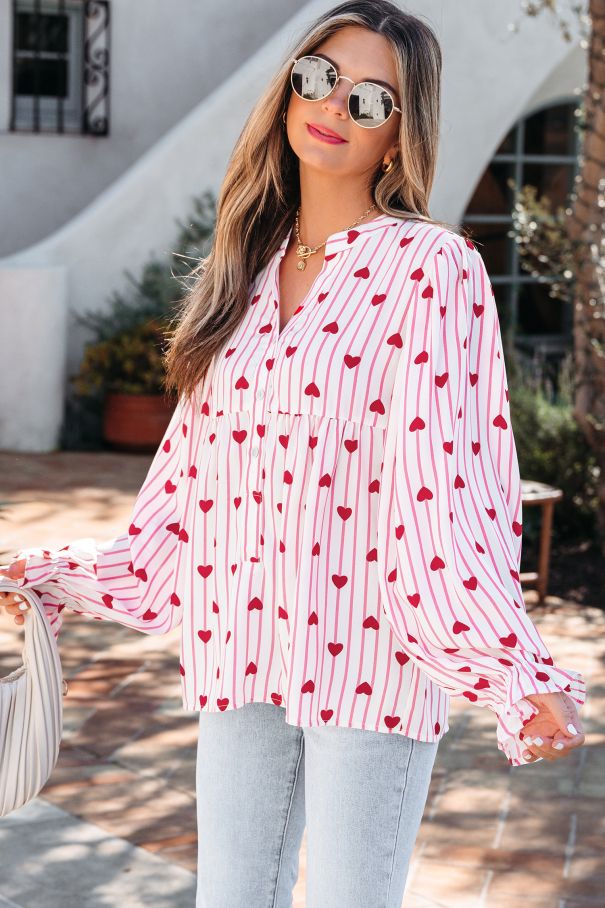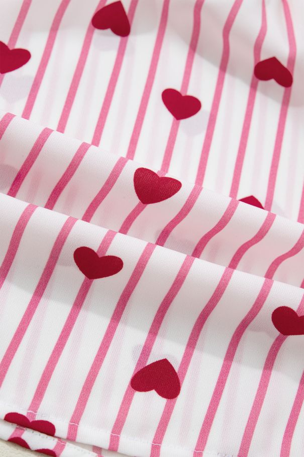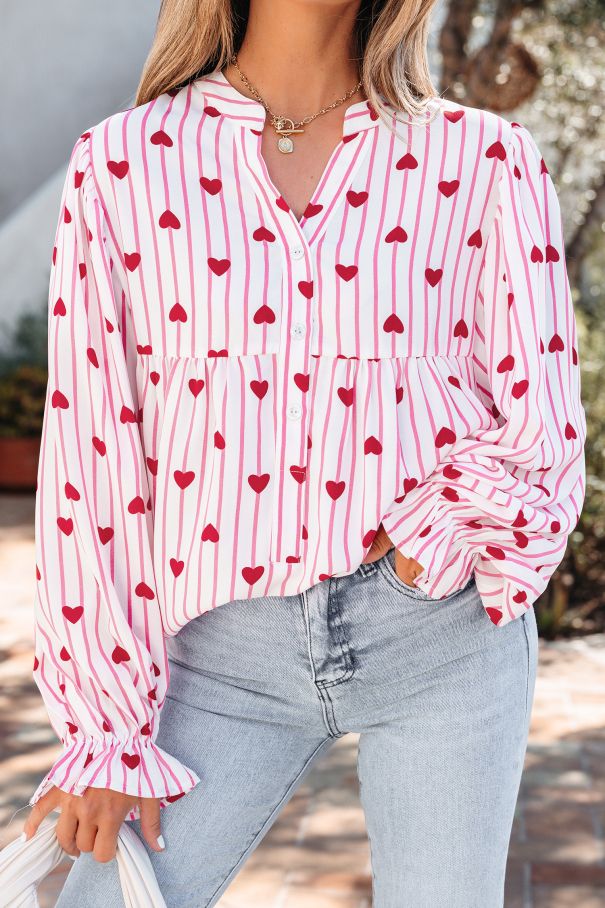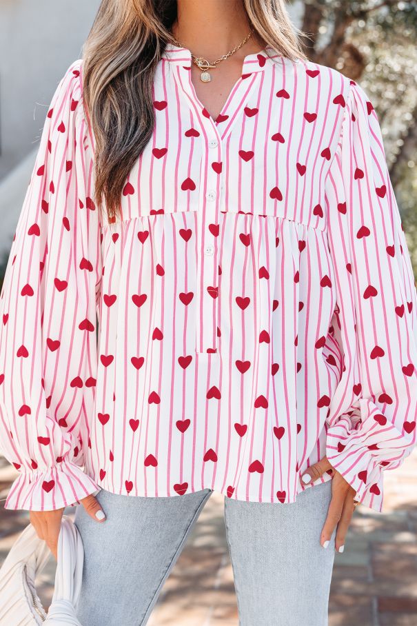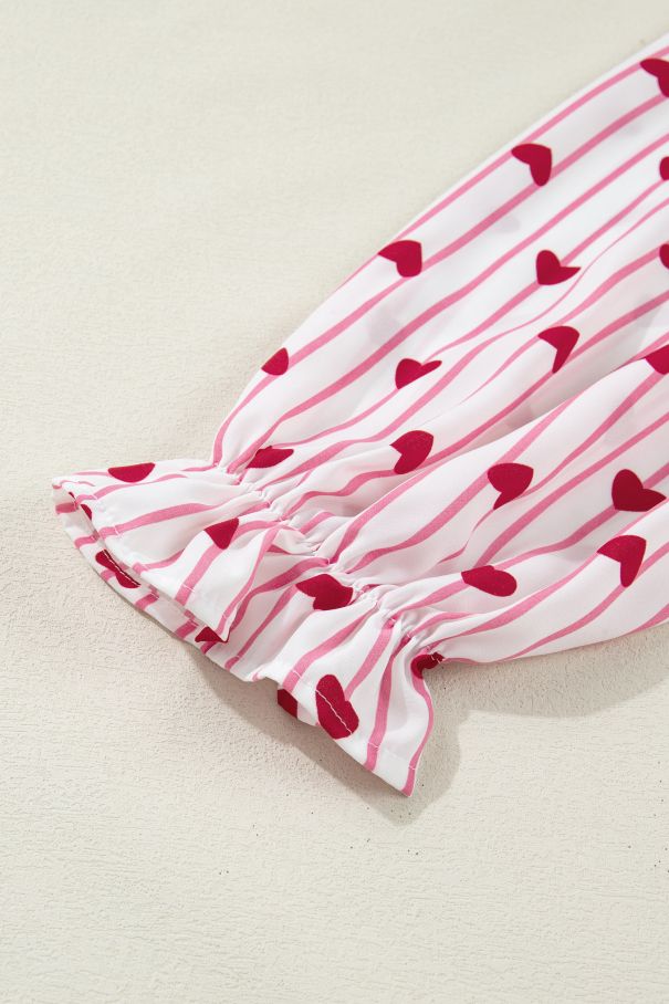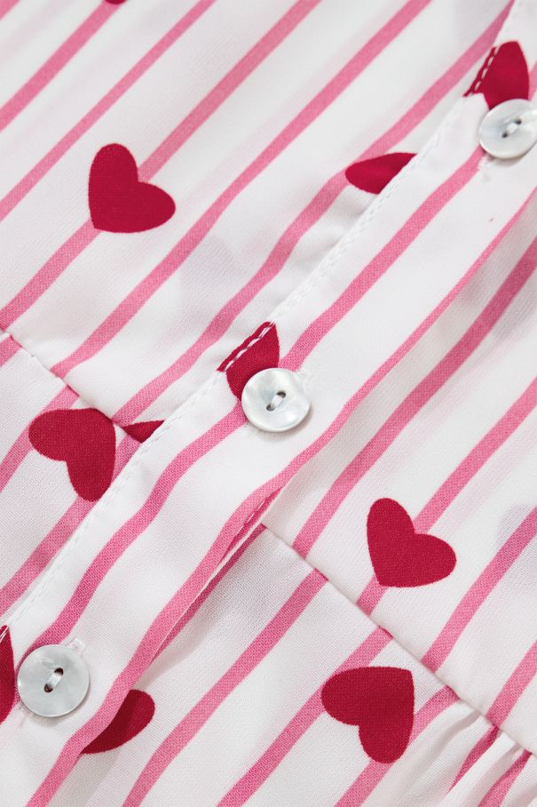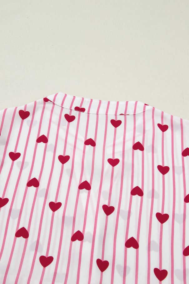 - Дамска риза в бяло и червено с вертикално райе и закачлив принт на сърца.